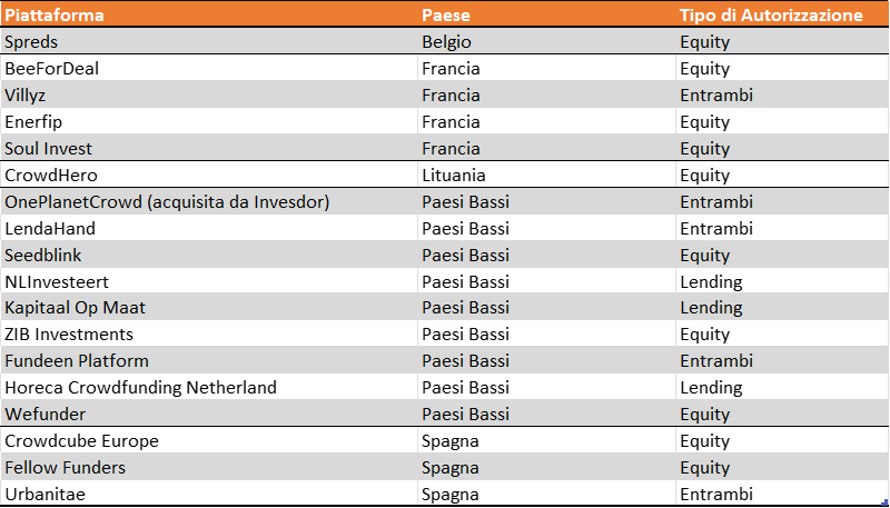 Di seguito è riportato l’elenco delle attuali piattaforme approvate ad oggi secondo il regolamento UE. Alcune di esse sono focalizzate sul debito, mentre altre sono verticali e orientate al settore immobiliare o all’energia rinnovabile. Alcune di loro prevedono di offrire transazioni secondarie tramite un servizio di tipo bacheca, l’unica modalità di mercato secondario concessa dal regolamento.