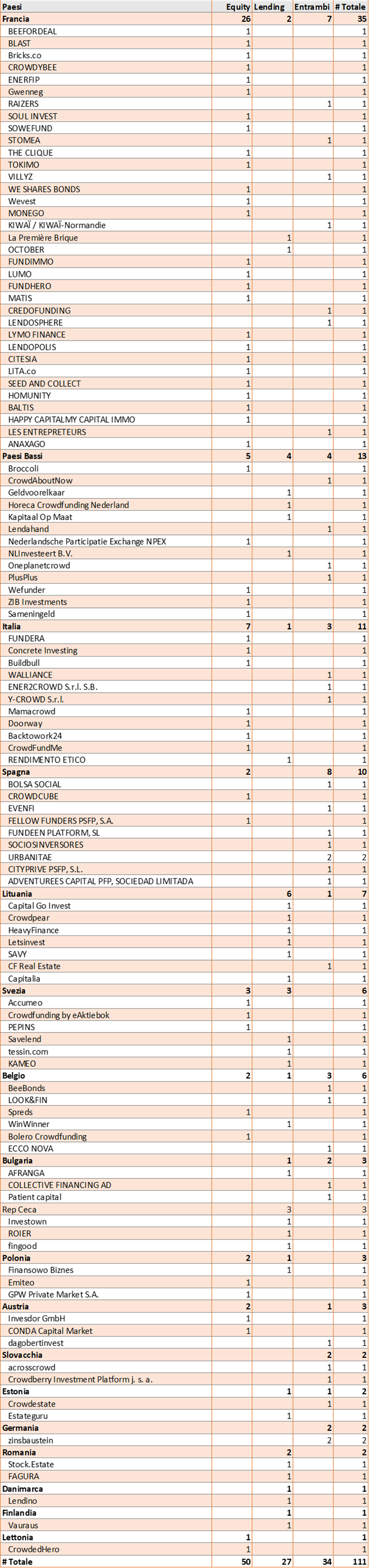 Di seguito riportiamo l’elenco di tutte le piattaforme per Paese e per tipologia di crowdfunding: Equity, Lending o Entrambi.