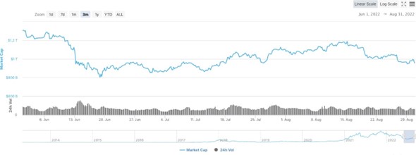 Nel trimestre in esame il valore del mercato cripto è sceso ancora. Nell’arco dei tre mesi, Bitcoin è passato dai $32k di inizio giugno ai $20k di fine Agosto. La market cap delle criptovalute è passata da $1.3T a $950M a fine agosto.