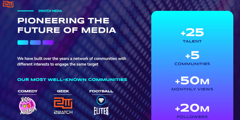 2WATCH è posizionata in modo unico nel settore del digital entertainment, grazie alla combinazione di tecnologia innovativa, know-how accumulato e partnership strategiche con brand globali.