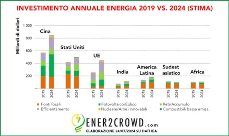 Gli investimenti in Unione Europea sono complessivamente comparabili a quelli negli Stati Uniti, osservano gli analisti, ma bilanciati a favore del settore “clean”, grazie alle politiche di transizione sostenibile, con un importantissimo focus sull’efficienza energetica negli usi finali dove l’Europa mantiene una forte leadership culturale e tecnologica.