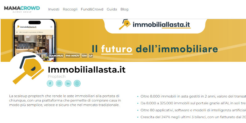 Immobiliallasta.it è una scaleup proptech, parte dell’ecosistema Reviva, che vuole rendere le aste immobiliari alla portata di tutti. Il 30 novembre ha lanciato una campagna di Equity Crowdfunding su Mamacrowd per potenziare lo sviluppo tecnologico della piattaforma e la notorietà del brand (qui la nostra scheda su Crowd Monitor).
